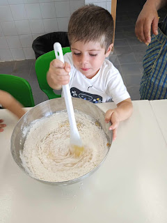 Com muito empenho e, num ambiente alegre as bolachinhas foram tomando forma ou, sem forma não importa pois a ideia é aprenderem e divertirem-se. Na taça, foram deitando os ovos, a farinha, o açúcar, o óleo e a raspa de laranja. E agora toca a mexer tudo muito bem. Colocaram as bolachinhas num tabuleiro e as funcionárias da cantina meteram tudo nos fornos.
